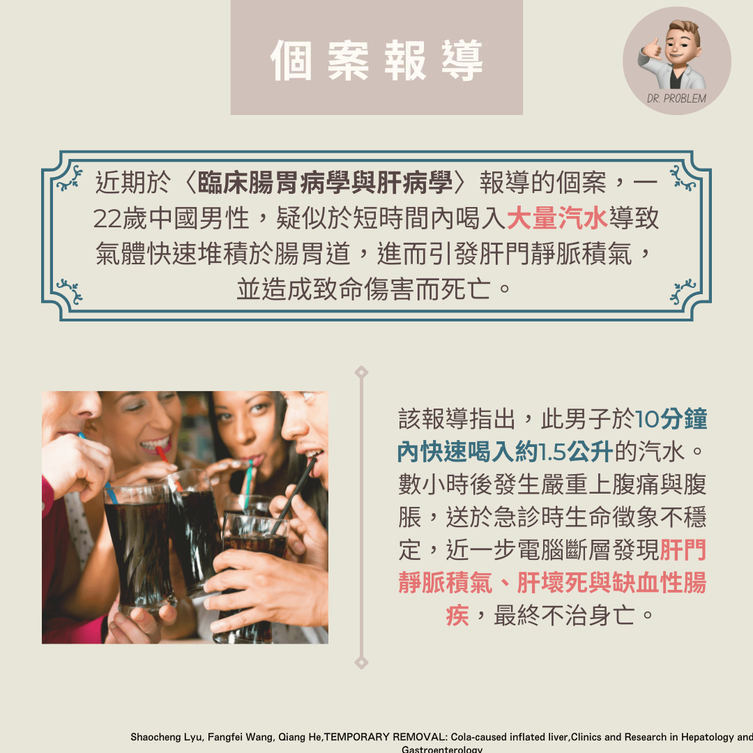 近期發表在<臨床腸胃病學與肝病學>的個案報導,該中國男子快速喝完可樂後的數小時因肝壞死與腸壞死身亡。該文章推測是因為短時間內腸胃壓力上升導致氣體跑入血管中,進而造成一連串的併發症。 不過,奇怪的是該文章於近期被下架,可能是因為確切死因還有待於釐清(畢竟目前無直接證據證明就是可樂的鍋),還是有其他原因或力量介入?看來還需等待後續的研究結果了。 不過可以確定的是,汽水喝太快確實會造成腹脹,喝太多也會對健康造成影響,肥宅快樂水適量,不要樂極生悲!